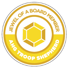 The Jewel of a Board Member Award honors and acknowledges Troop Board Members for their investment in leading the Troop with excellence. There are five separate awards, one for each Troop Board position, each with their own set of requirements. The requirements for earning Jewel of a Board Member Award can be found in AHGresource. Jewel of a Board Member Award Pins are worn on the AHG Membership Lanyard.