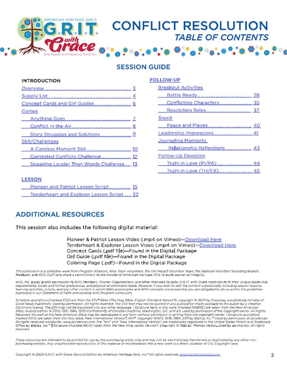 Session Materials:  Each Session Guide includes an overview of the session, supply checklist, games, skits and challenges, lesson script, link to lesson video download, breakout activities, a large group activity, journaling prompts, and a devotion to take back to your Troop meetings. Additional digital files for each session include a coloring sheet, key concept cards, and a guided notes and application guide for older girls.