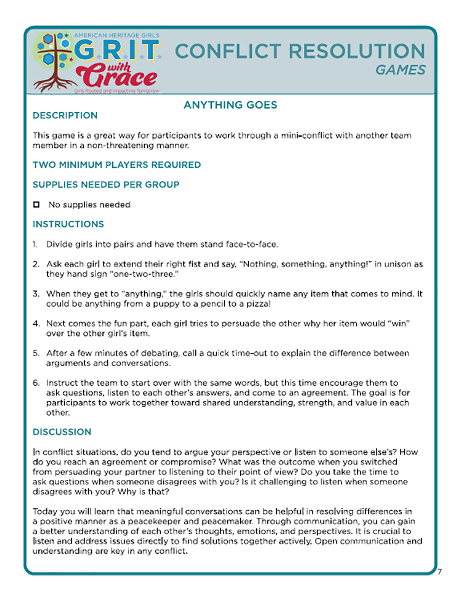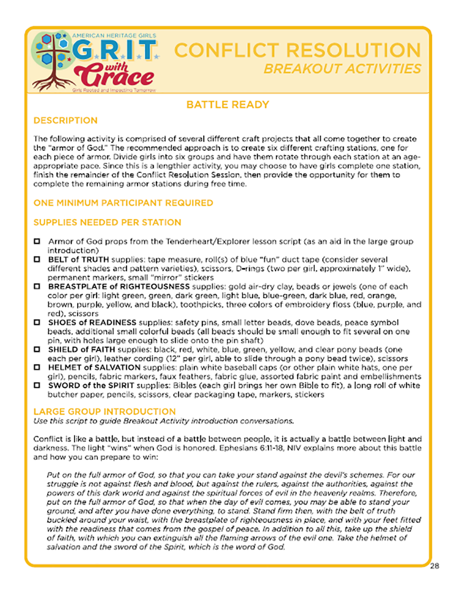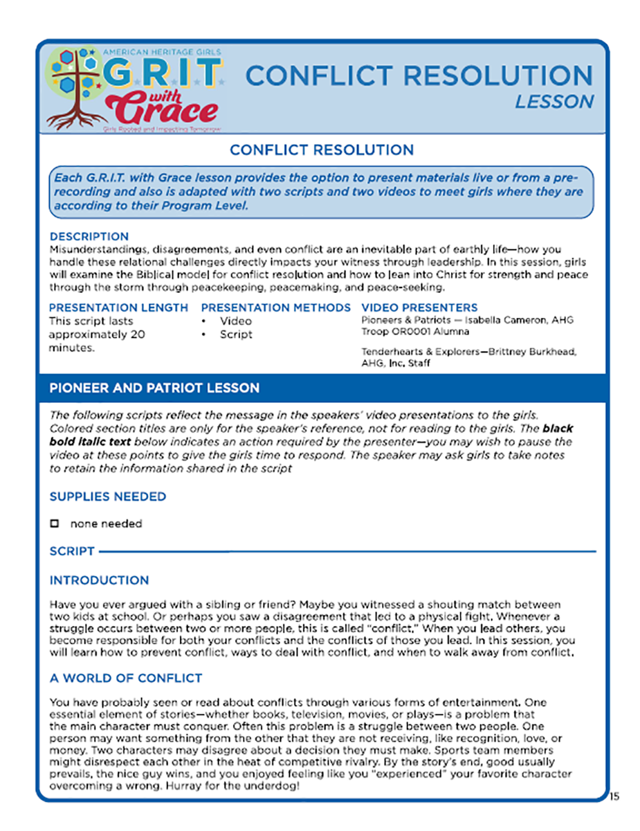 Conflict Resolution Session:  Along with the Biblical model of conflict resolution, girls will learn in this session when and how to lead as a peacekeeper, a peacemaker, and a peace seeker, covering each situation with love and prayer.  This session can also be purchased as a part of the Resilience Bundle.