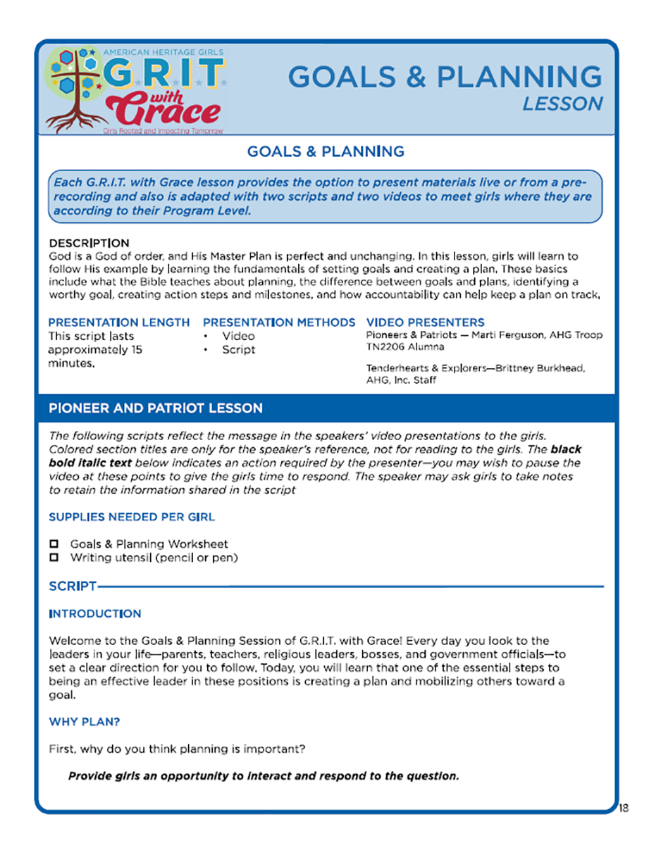 Session Materials: Each session guide includes an overview of the session, supply checklist, games, skits and challenges, lesson script, link to lesson video download, breakout activities, a large group activity, journaling prompts, and a devotion to take back to your Troop meetings. Additional digital files for each session include a coloring sheet, key concept cards, and a guided notes and application guide for older girls.