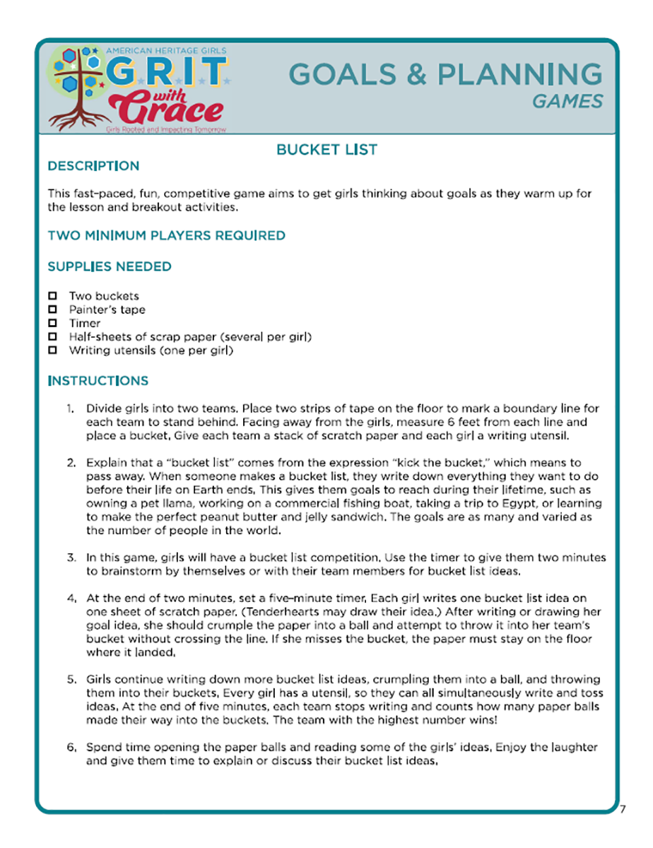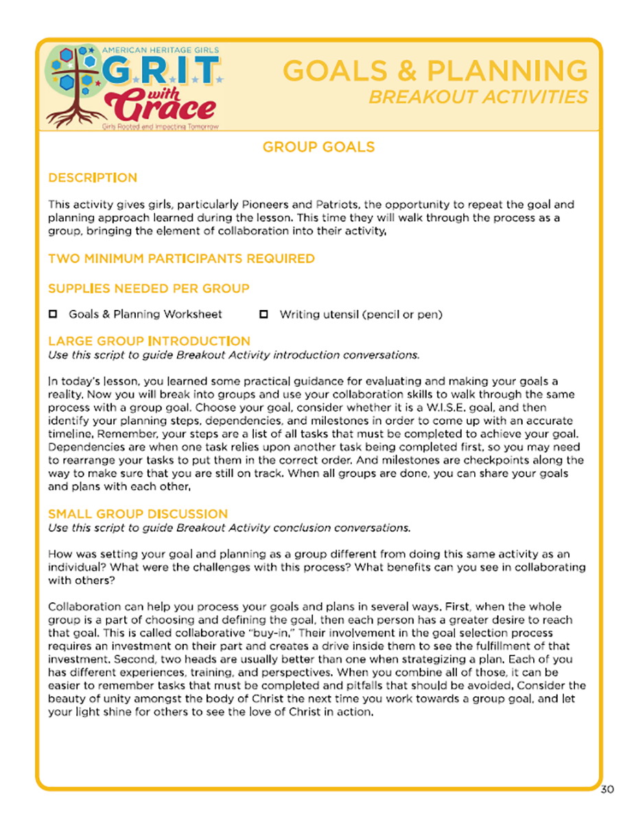 Goals & Planning Session: This session discusses orderly planning as a Godly attribute, evaluating girls' goals to determine if they are "W.I.S.E.", and how planned steps, timeline milestones, and accountability can help them achieve worthy goals. This session can also be purchased as a part of the Management Bundle.
