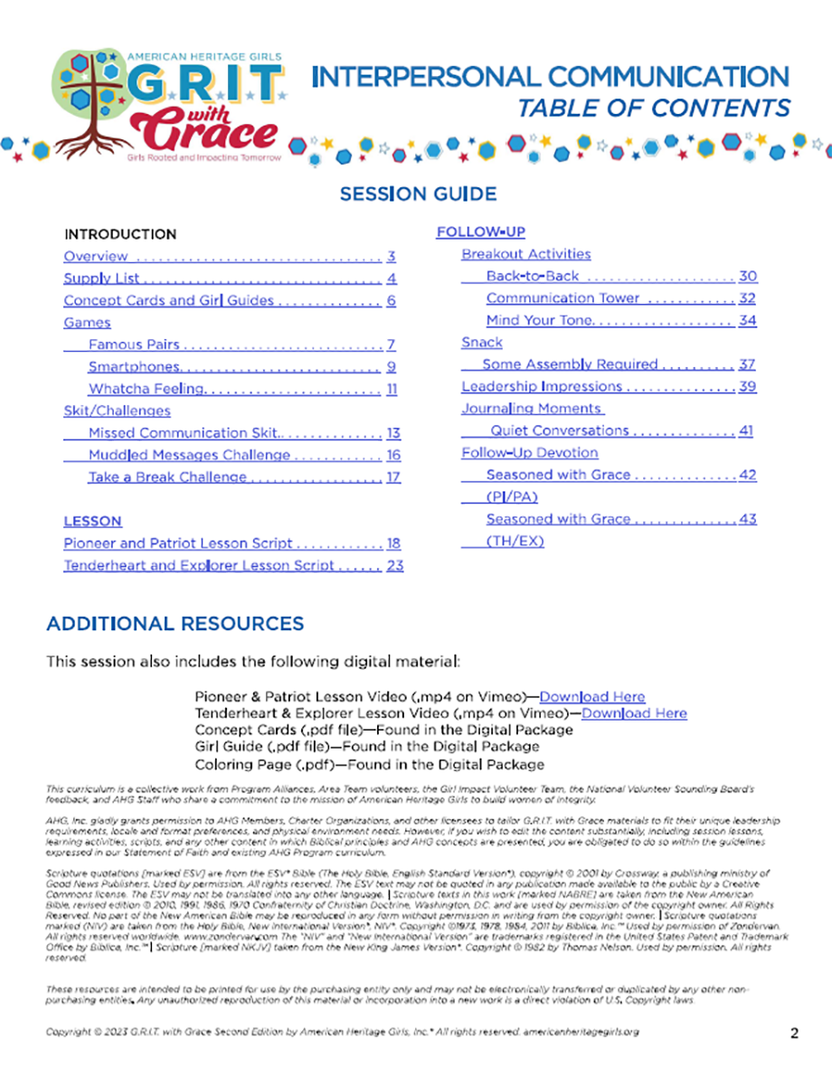 Session Materials: Each session guide includes an overview of the session, supply checklist, games, skits and challenges, lesson script, link to lesson video download, breakout activities, a large group activity, journaling prompts, and a devotion to take back to your Troop meetings. Additional digital files for each session include a coloring sheet, key concept cards, and a guided notes and application guide for older girls.
