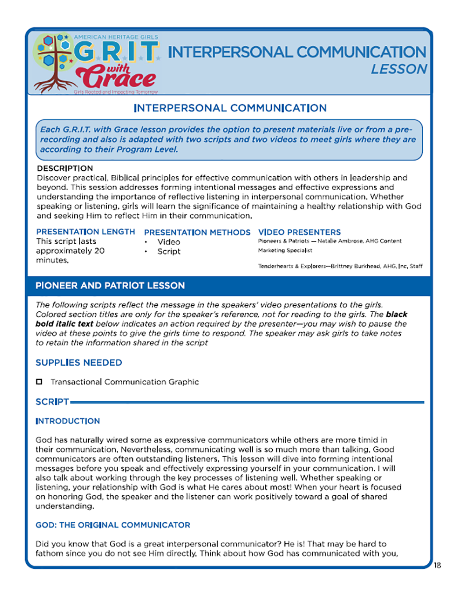 Interpersonal Communication Session: God was the Original Communicator, using verbal and nonverbal methods to relay His messages. In this session, girls will learn how transactional communication of listening and expressing can help meet the goal of shared understanding with those they lead. This session can also be purchased as a part of the Communication Bundle.