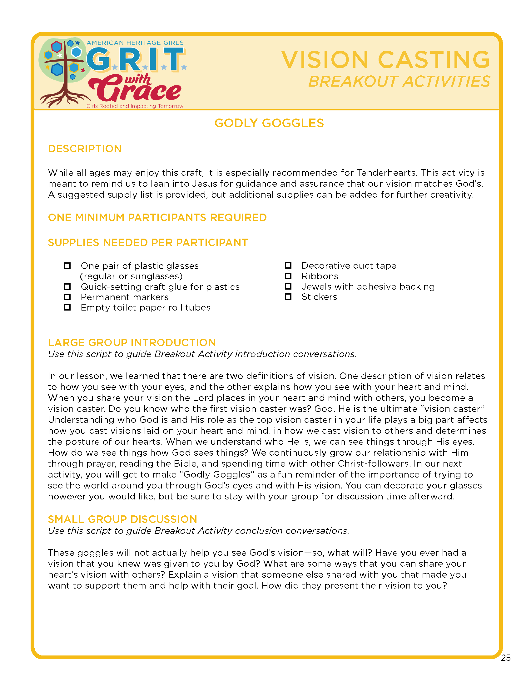 Vision Casting Session: Girls will leave this session with several helpful building blocks for better understanding, preserving, and sharing a vision in their own lives, such as the importance of vision, its source, and how to communicate it to others. This session can also be purchased as a part of the Communication Bundle.